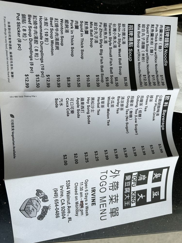 Welcome to Tofu King Irvine, a hidden gem located at 5394 Walnut Ave, Irvine, CA. This authentic Taiwanese restaurant specializes in a delightful menu that transports you straight to Taiwan with each bite. The standout dish is the Ground Pork Rice, which pairs beautifully with their crispy fried pork chop and savory simmered pork feet. For soup enthusiasts, the Meat Ball Soup with Noodles offers a comforting broth enriched with tasty meatballs, while the Fu Zhou Style Big Fish Ball Soup features handmade fish balls in a clear, flavorful broth.